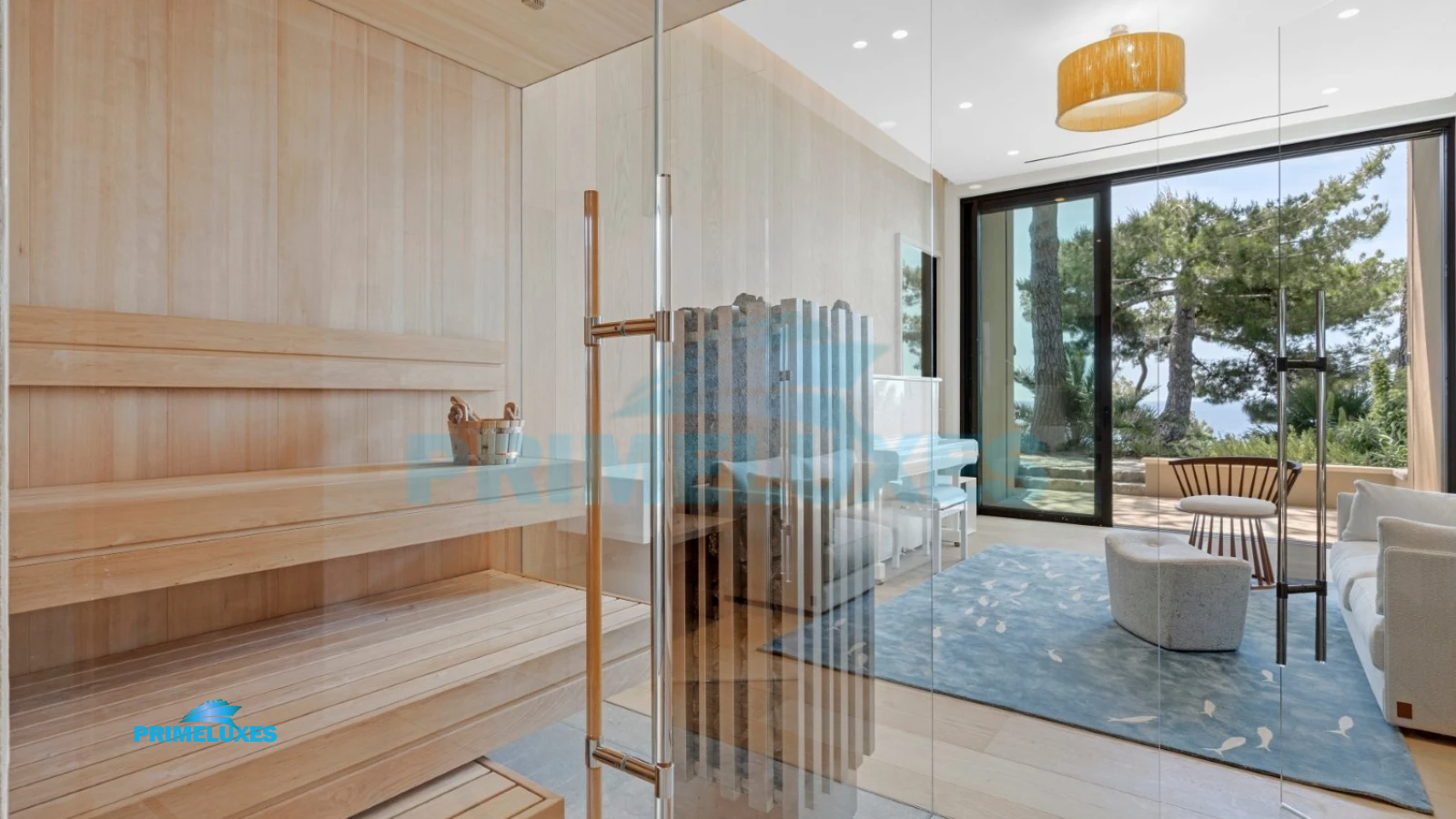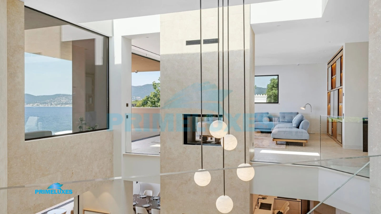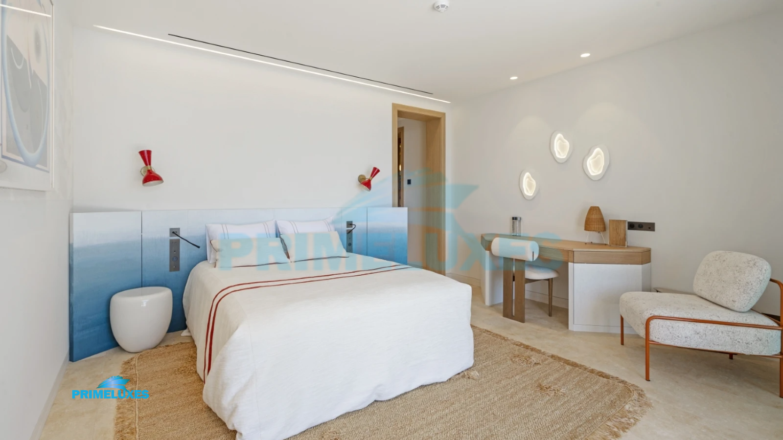 At the heart of the home lies a grand cathedral-style living space, where soaring ceilings enhance the sense of openness. Every detail reflects the vastness of the Mediterranean, creating an immersive experience that blends indoor luxury with the breathtaking surroundings. Light floods through the villa, accentuating the purity of its architectural lines and enhancing the tranquil ambiance.