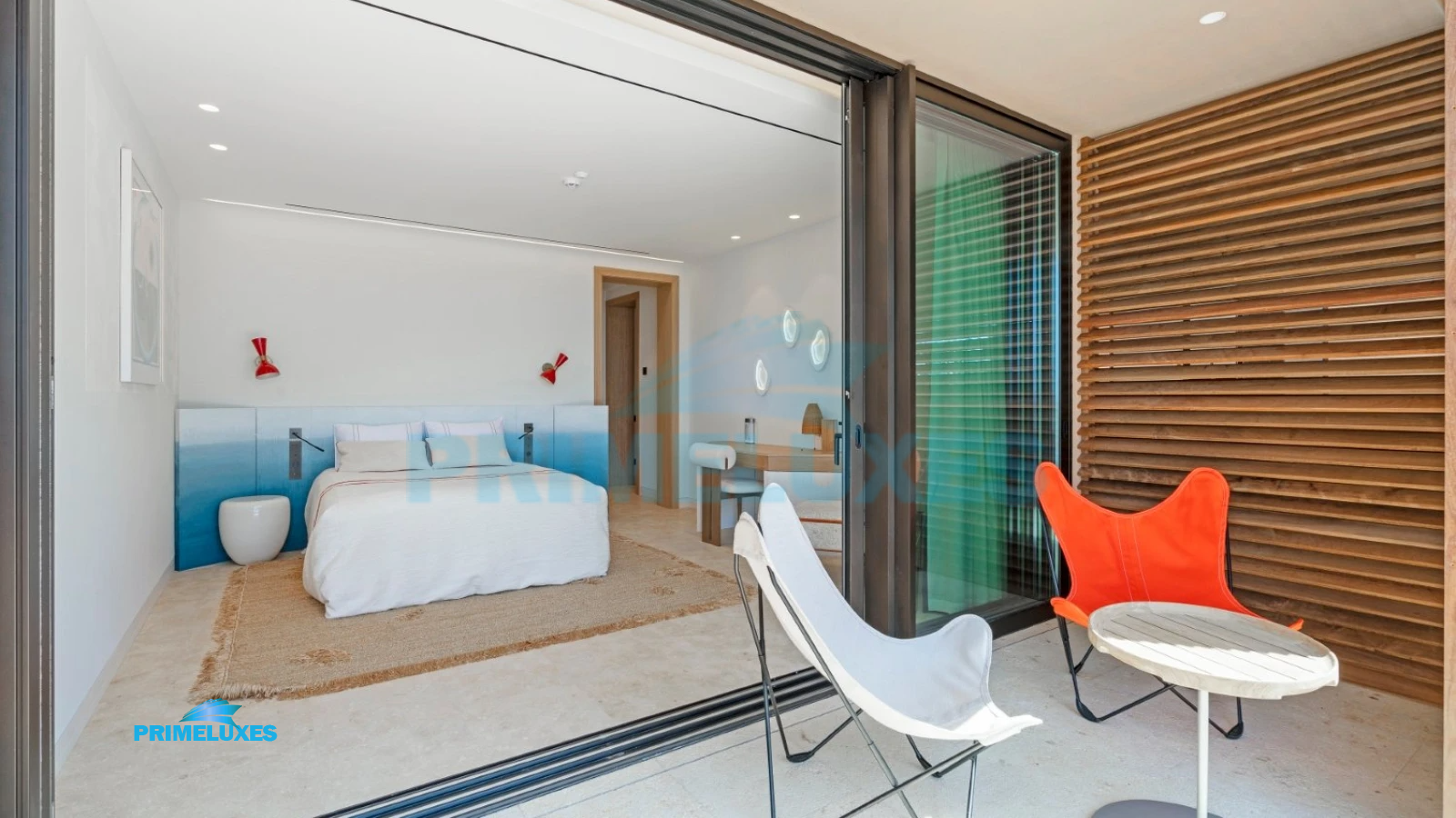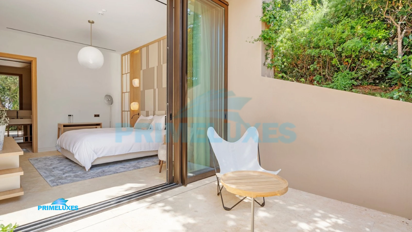 The villa’s six en-suite bedrooms are designed with natural tones and impeccable taste, offering private sanctuaries of peace. Bathed in natural light, each room ensures unparalleled comfort while maintaining a seamless connection to the outdoors.