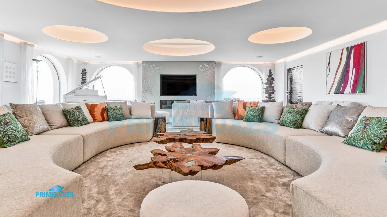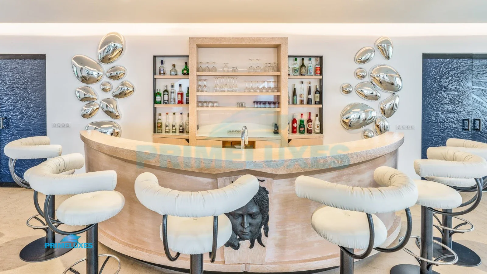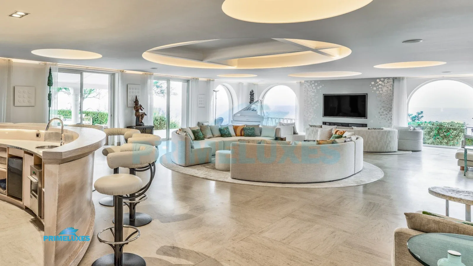 At the heart of Villa Cascade, the expansive living room is the perfect backdrop for memorable gatherings. An elegant bar, a piano for music lovers, and plush circular sofas create an ambiance of sophistication and warmth. Whether sharing an aperitif, enjoying live music, or relaxing with friends, the villa offers an atmosphere of both grandeur and intimacy.