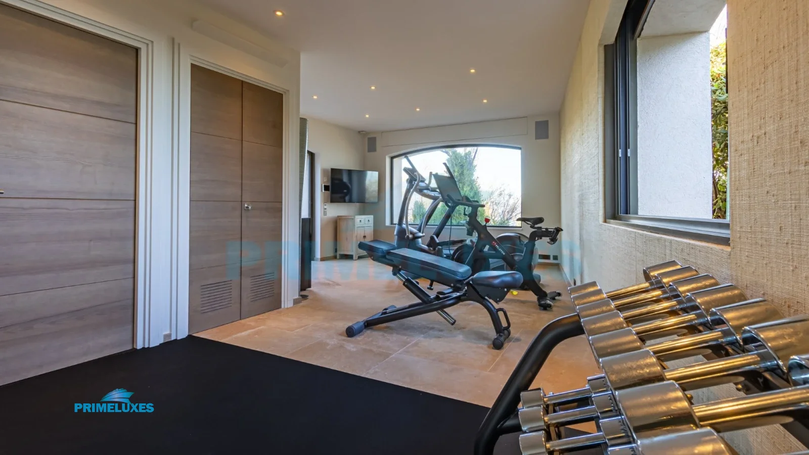 The heated infinity pool appears to merge with the horizon, while shaded terraces provide elegant spaces for relaxation and al fresco dining. A fully equipped indoor fitness room, bathed in natural light, ensures wellness routines are maintained without sacrificing the stunning sea views.