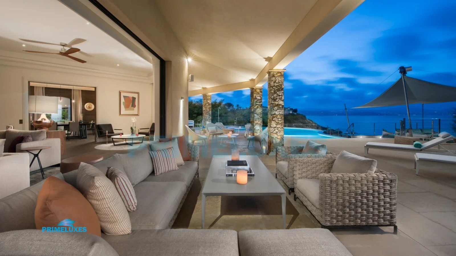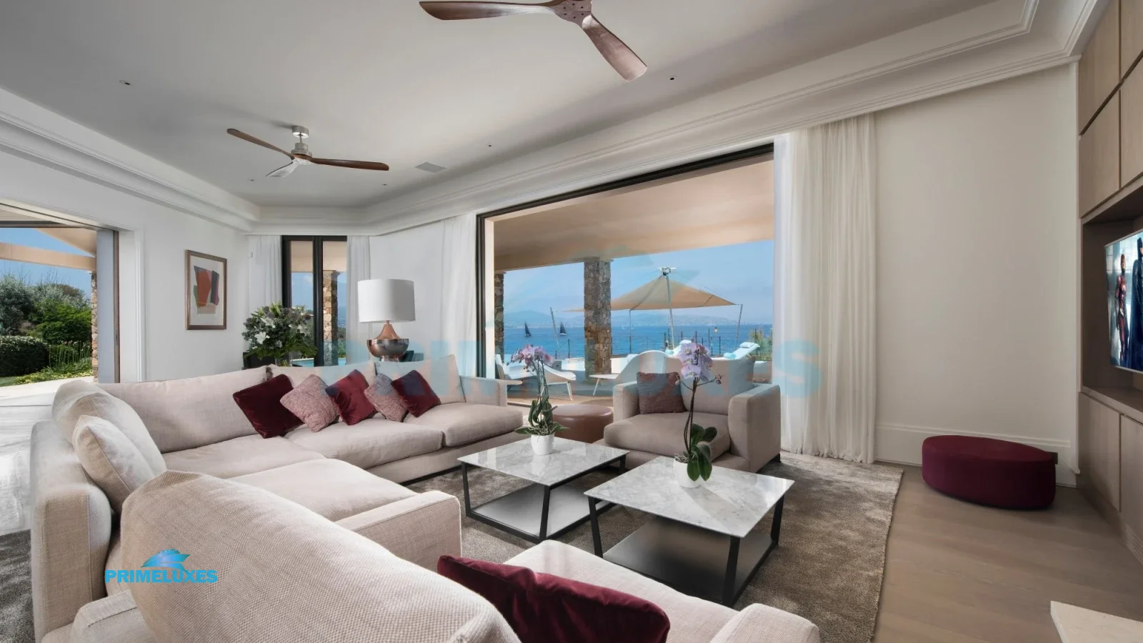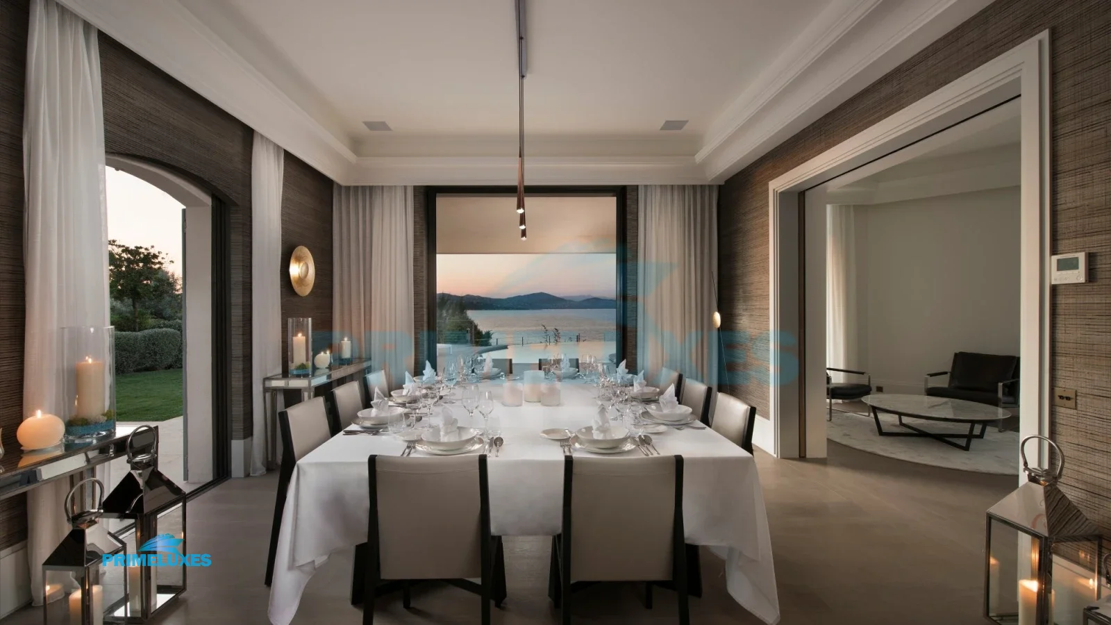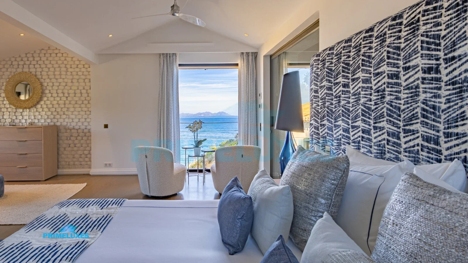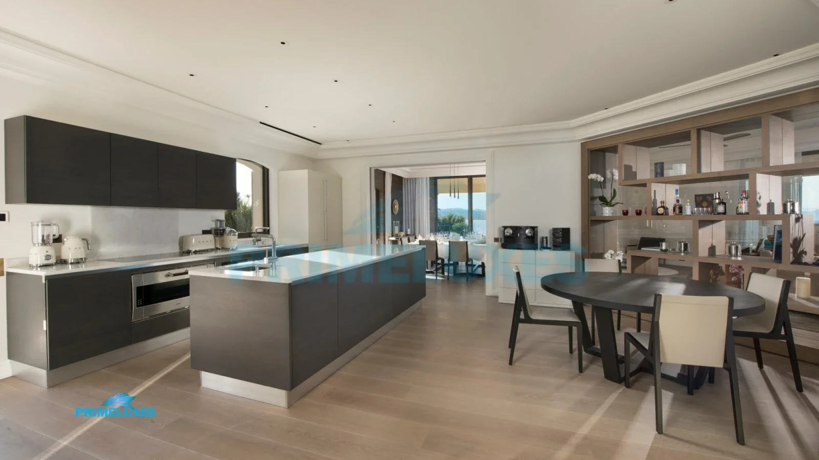 Noble materials define the interiors, from polished marble and natural stone to bespoke furnishings, fine textiles, and curated artworks. The expansive living room opens seamlessly to the sea-facing terraces, inviting moments of quiet contemplation. A state-of-the-art Bulthaup kitchen merges sleek design with high functionality, ideal for a private chef to craft culinary masterpieces.