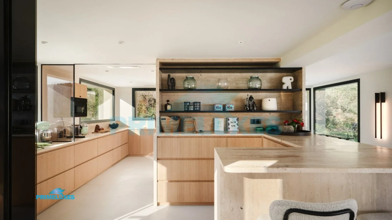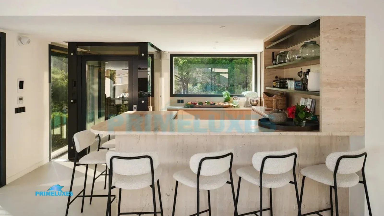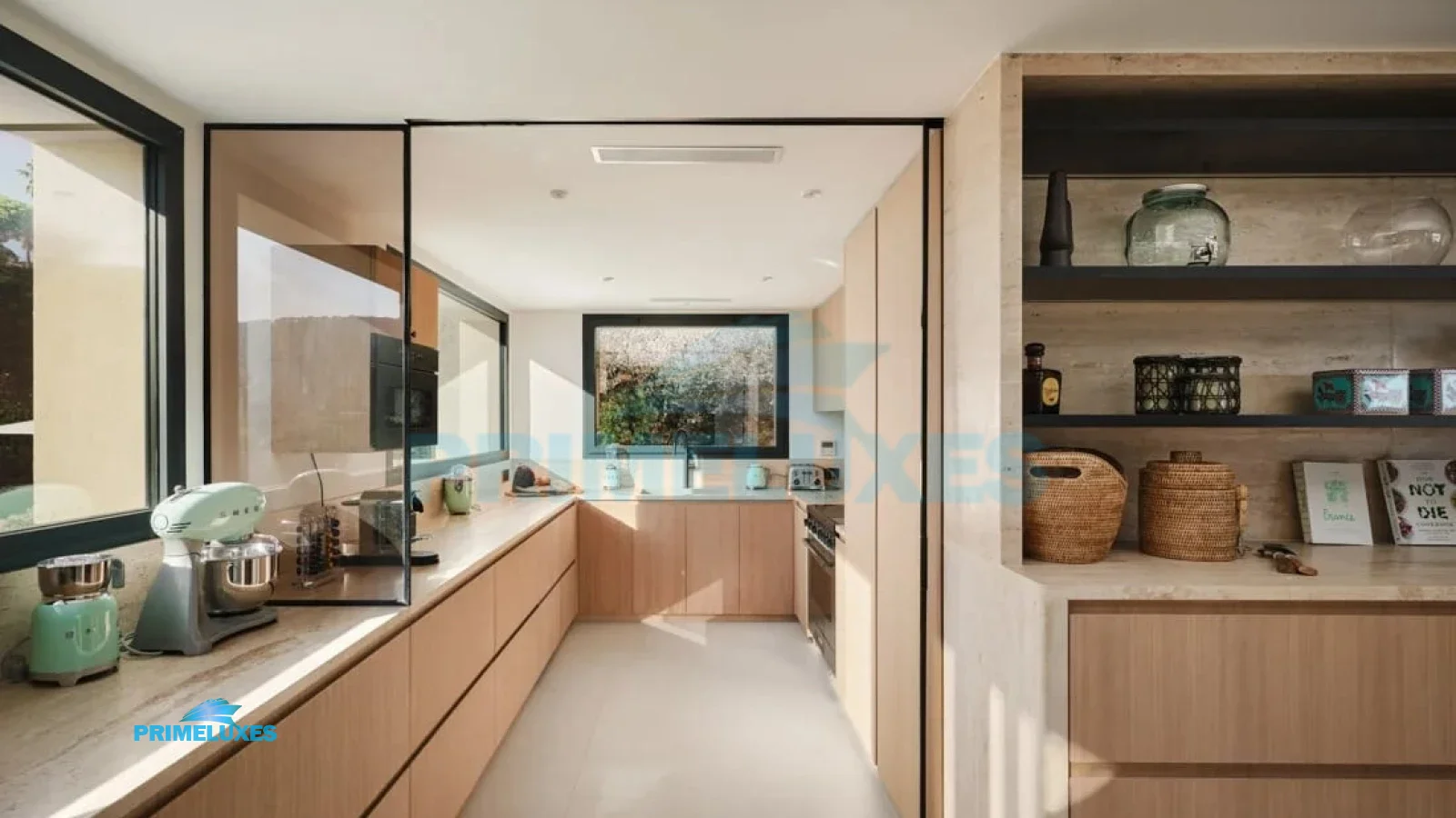 The living room, decorated in soft tones of cream, beige, sage, and warm woods, radiates understated elegance. Contemporary furnishings balance comfort with style, making it a perfect space for family moments or intimate evenings. The minimalist kitchen, both functional and welcoming, flows naturally into the dining area and terraces—ideal for al fresco dining by the sea or under a star-filled sky.