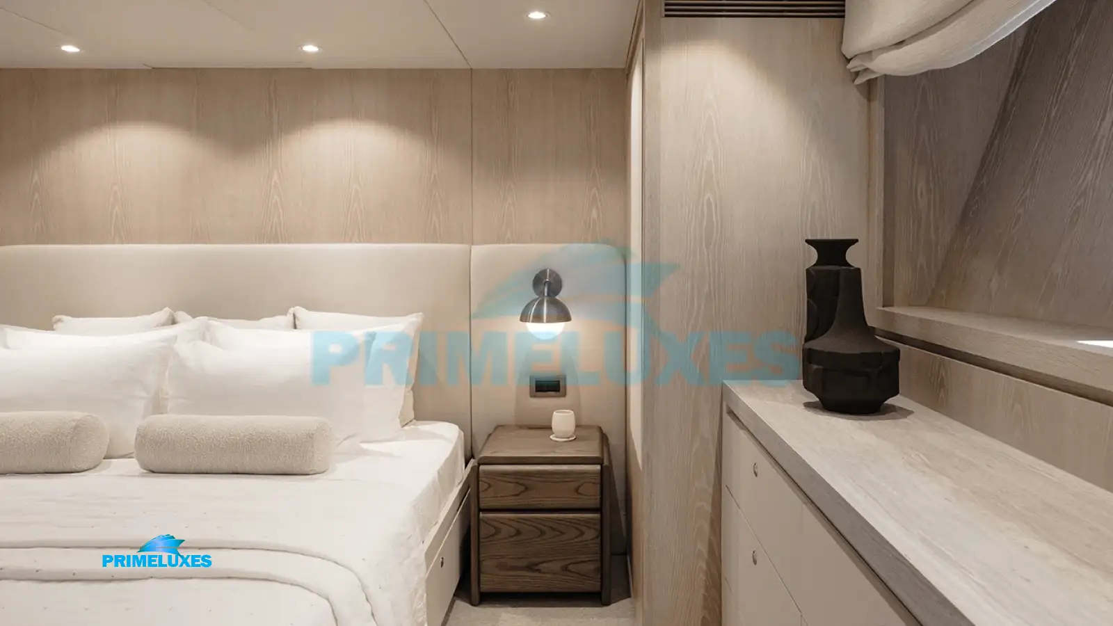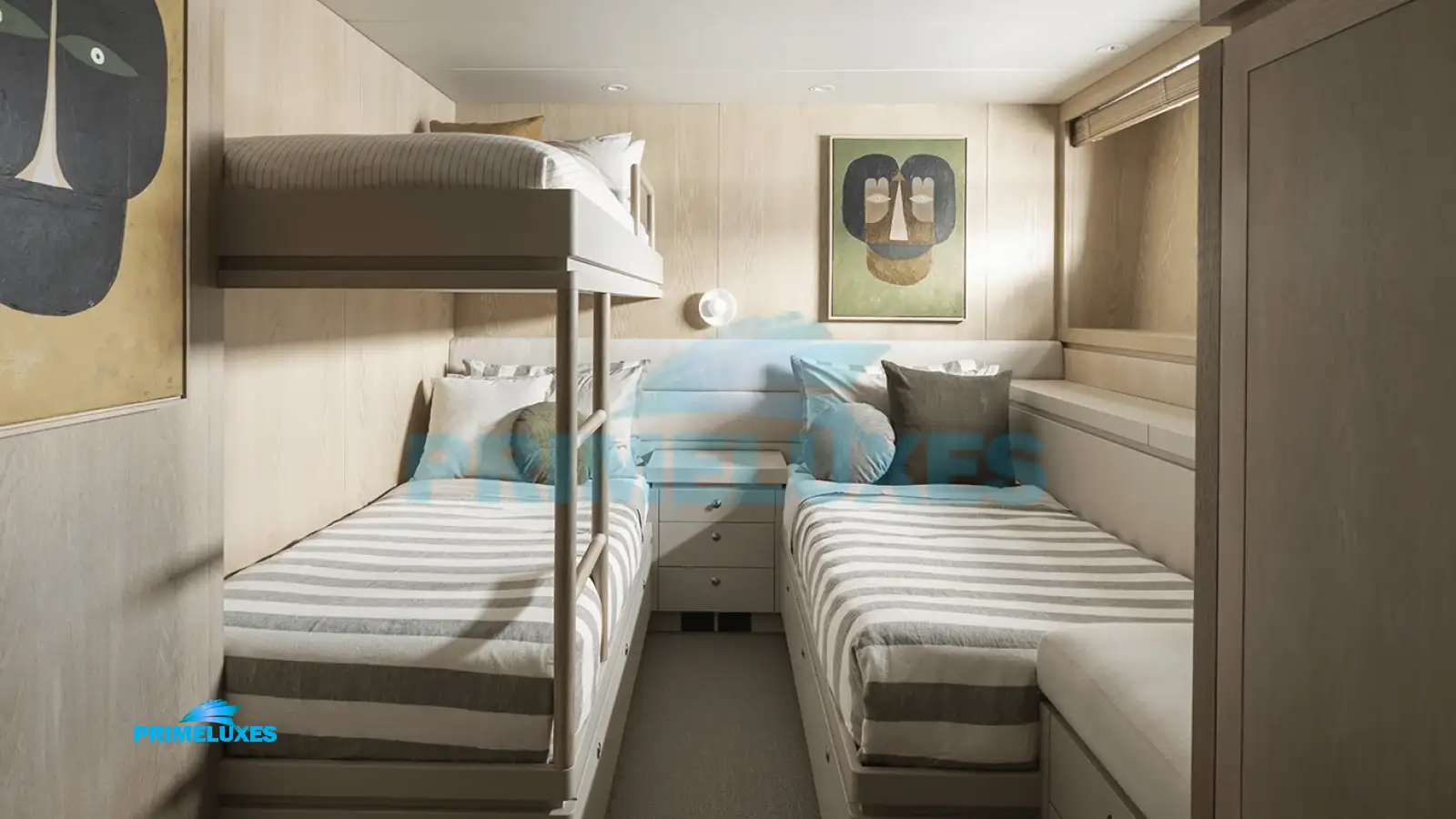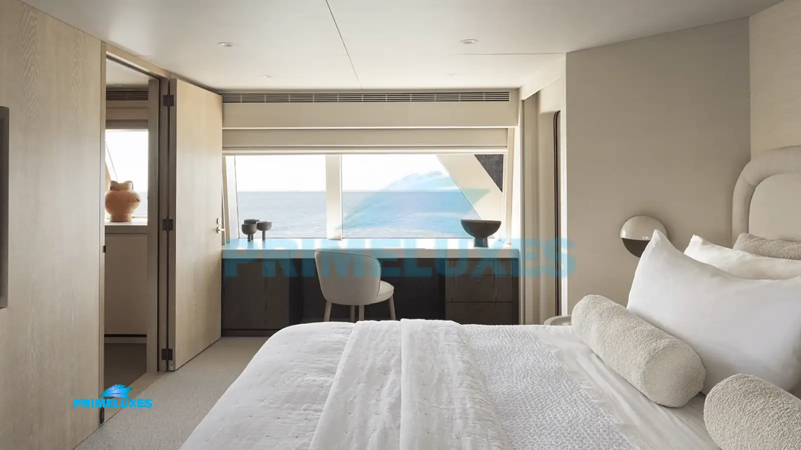 The full-beam master suite is an exquisite private retreat, offering generous proportions and refined detailing, complemented by an expansive dressing room that provides abundant storage space. In total, AKIKO accommodates guests with nine luxurious beds, including two king-size beds, one queen, and six singles, ensuring flexibility and comfort for every guest arrangement.