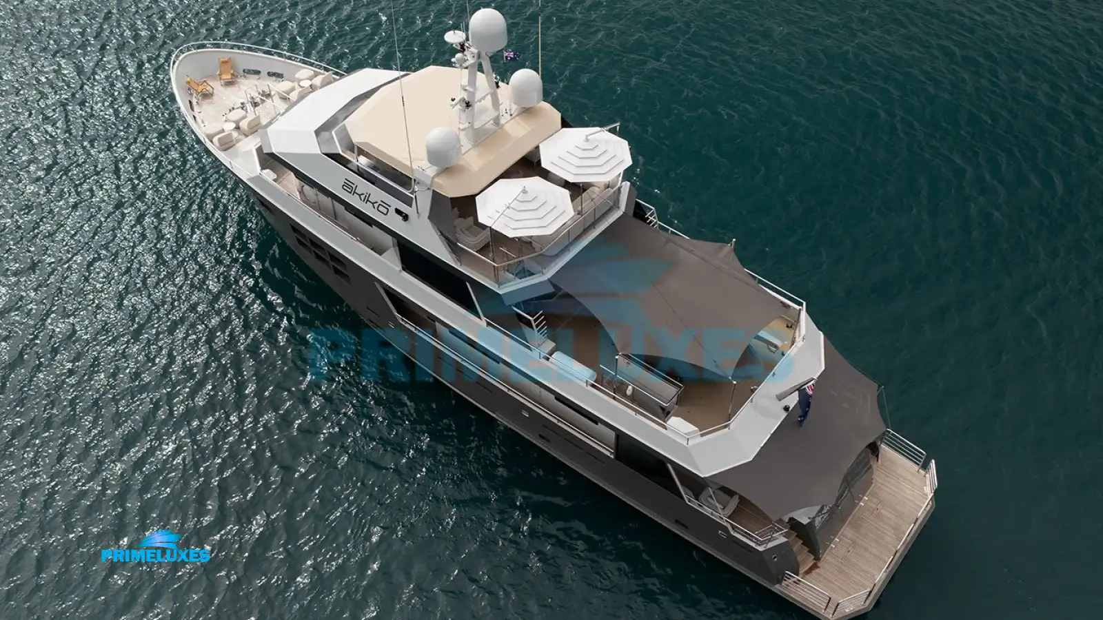 Constructed with an aluminium hull and aluminium superstructure, AKIKO offers exceptional durability, stability, and generous onboard space. Her full-displacement hull ensures remarkable comfort while cruising and superior stability when at anchor.