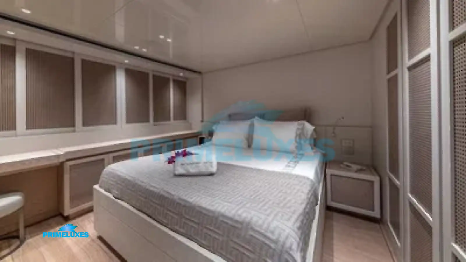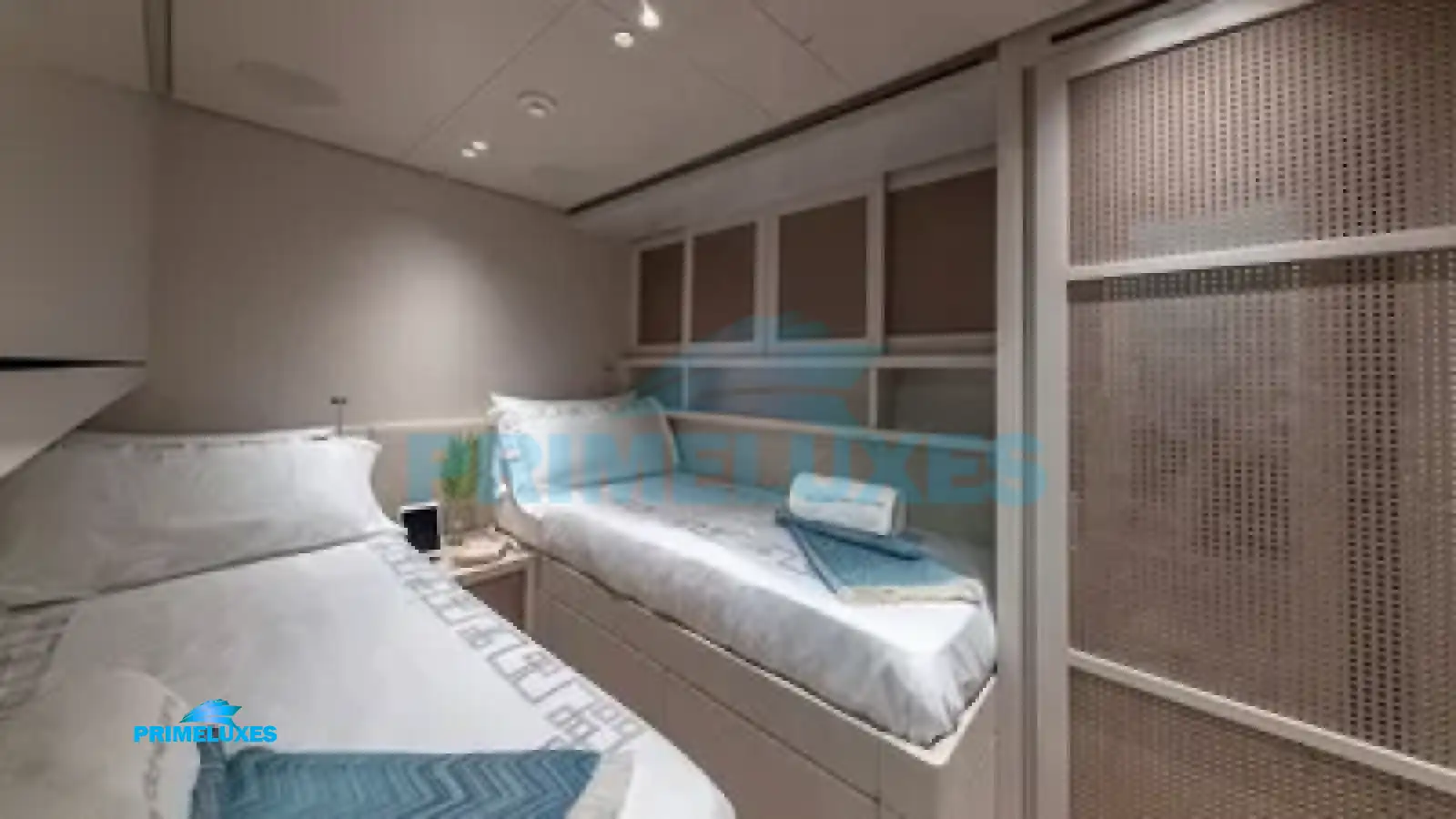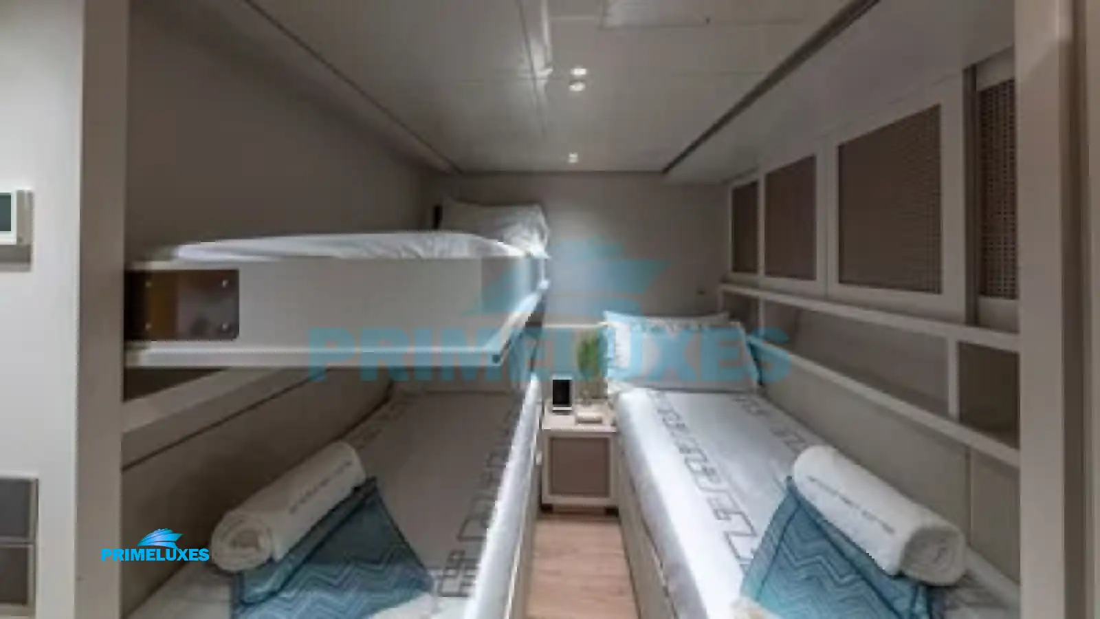 The sleeping arrangement includes three double beds, two singles, and one Pullman berth, ensuring flexibility without compromising comfort. A professional crew of up to five dedicated members is on hand to provide attentive service throughout your journey, ensuring a seamless and indulgent charter experience from start to finish.
