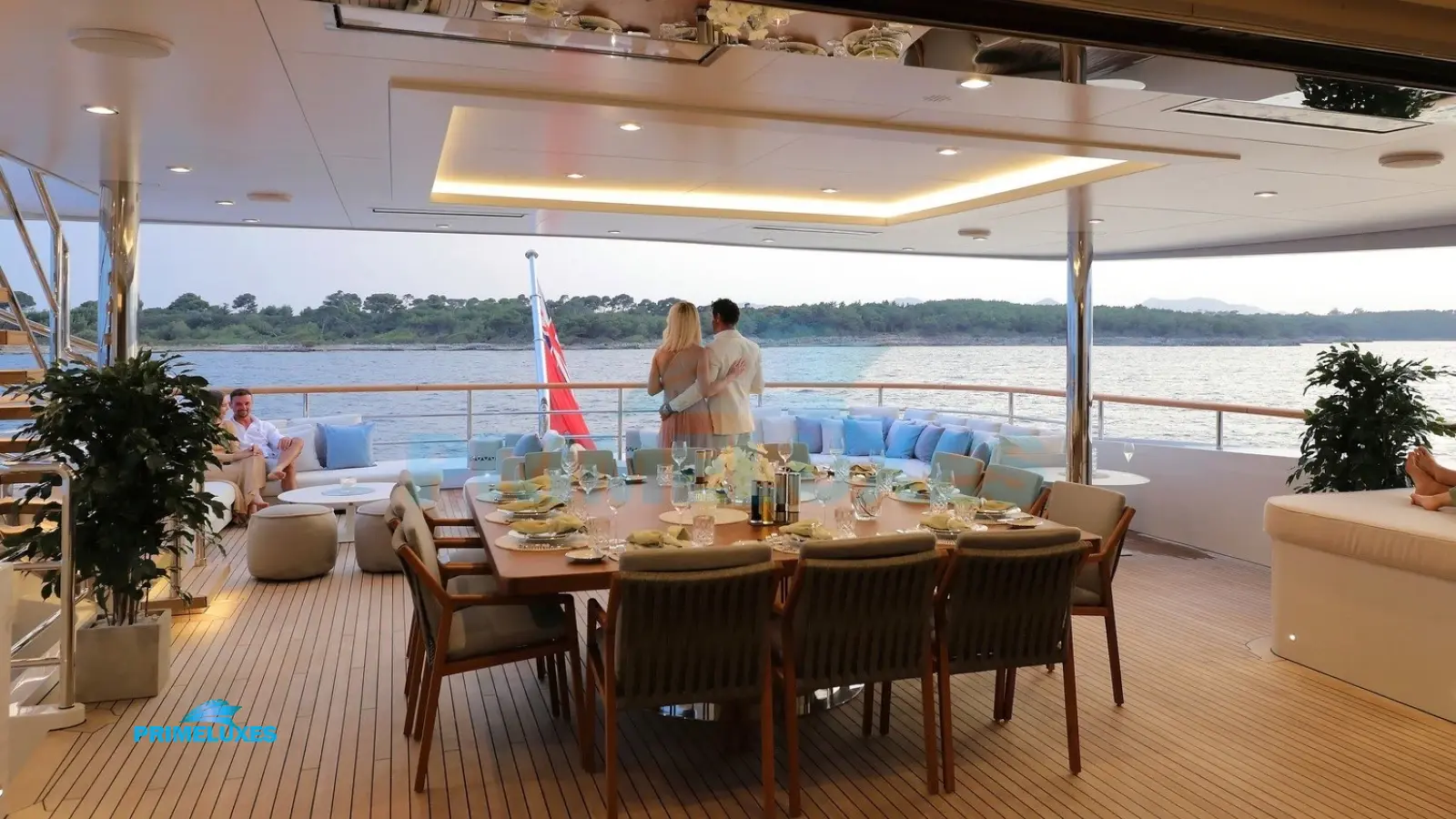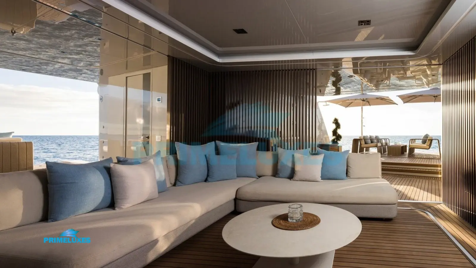 Main Deck: Spacious lounging areas, a formal dining setup, and direct beach club access.
