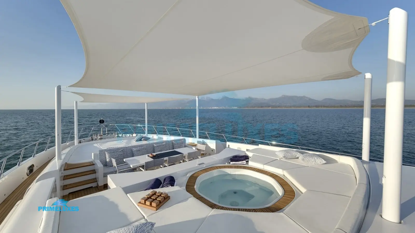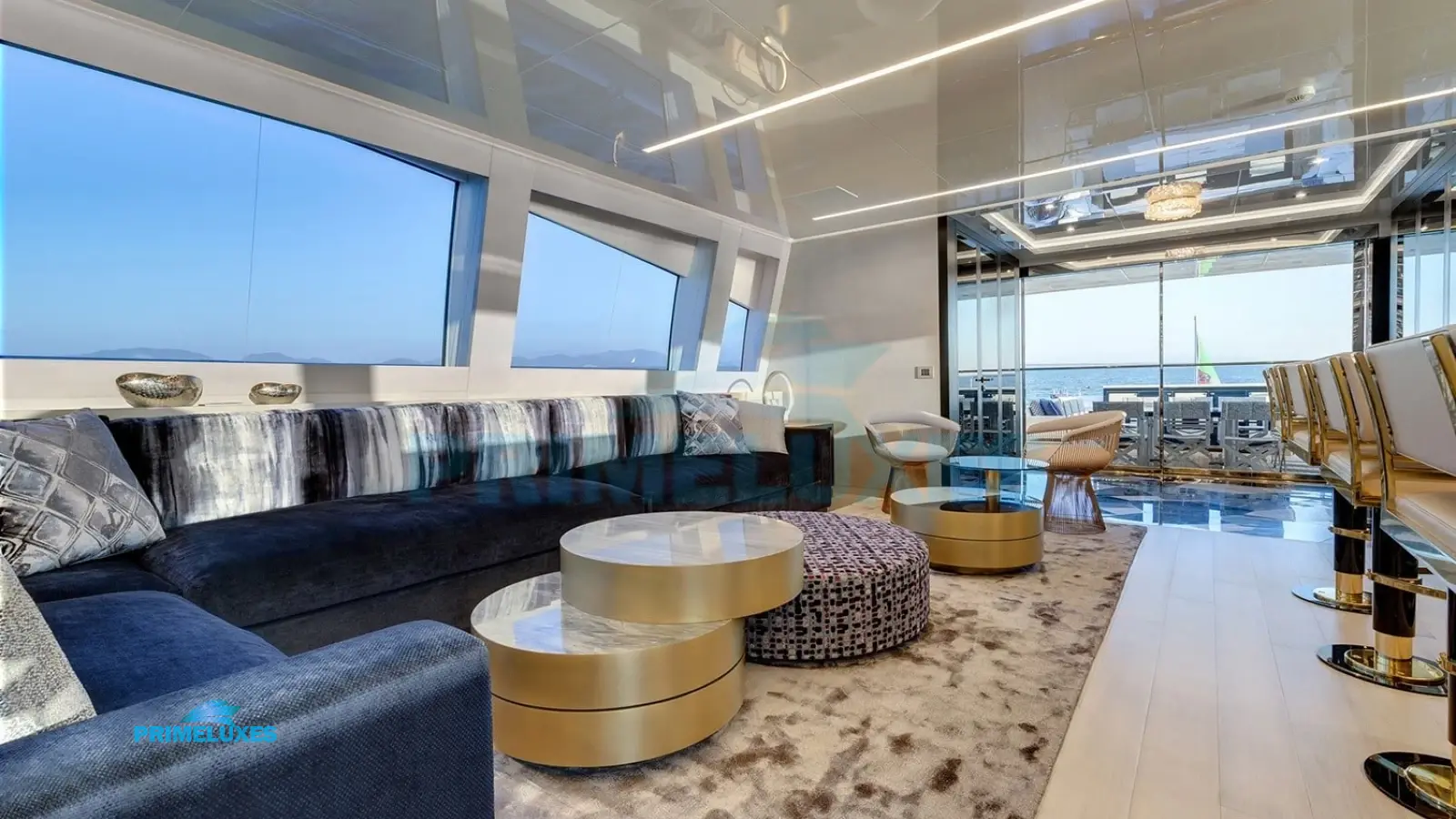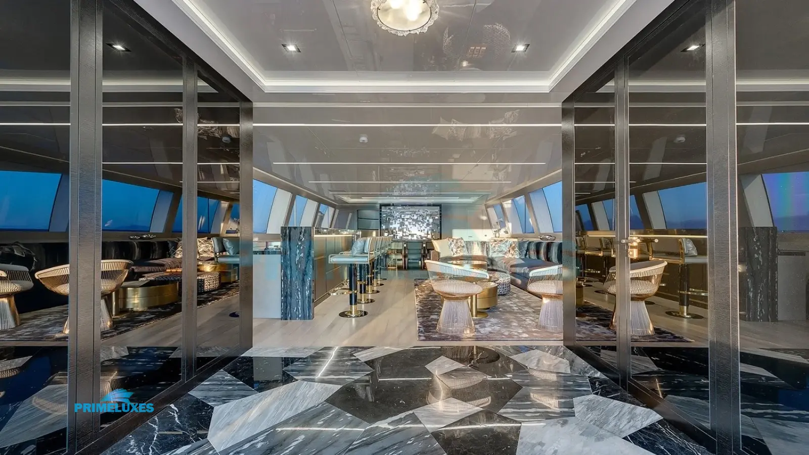 Step inside to discover a world of mirrored illusions, rich textures, and sophisticated décor, where every space exudes opulence. The flybridge is a highlight, featuring a large bar and plush lounge area, perfect for sunset cocktails with panoramic Mediterranean views. Forward, a spacious solarium and inviting Jacuzzi create an idyllic setting for relaxation under the sun.