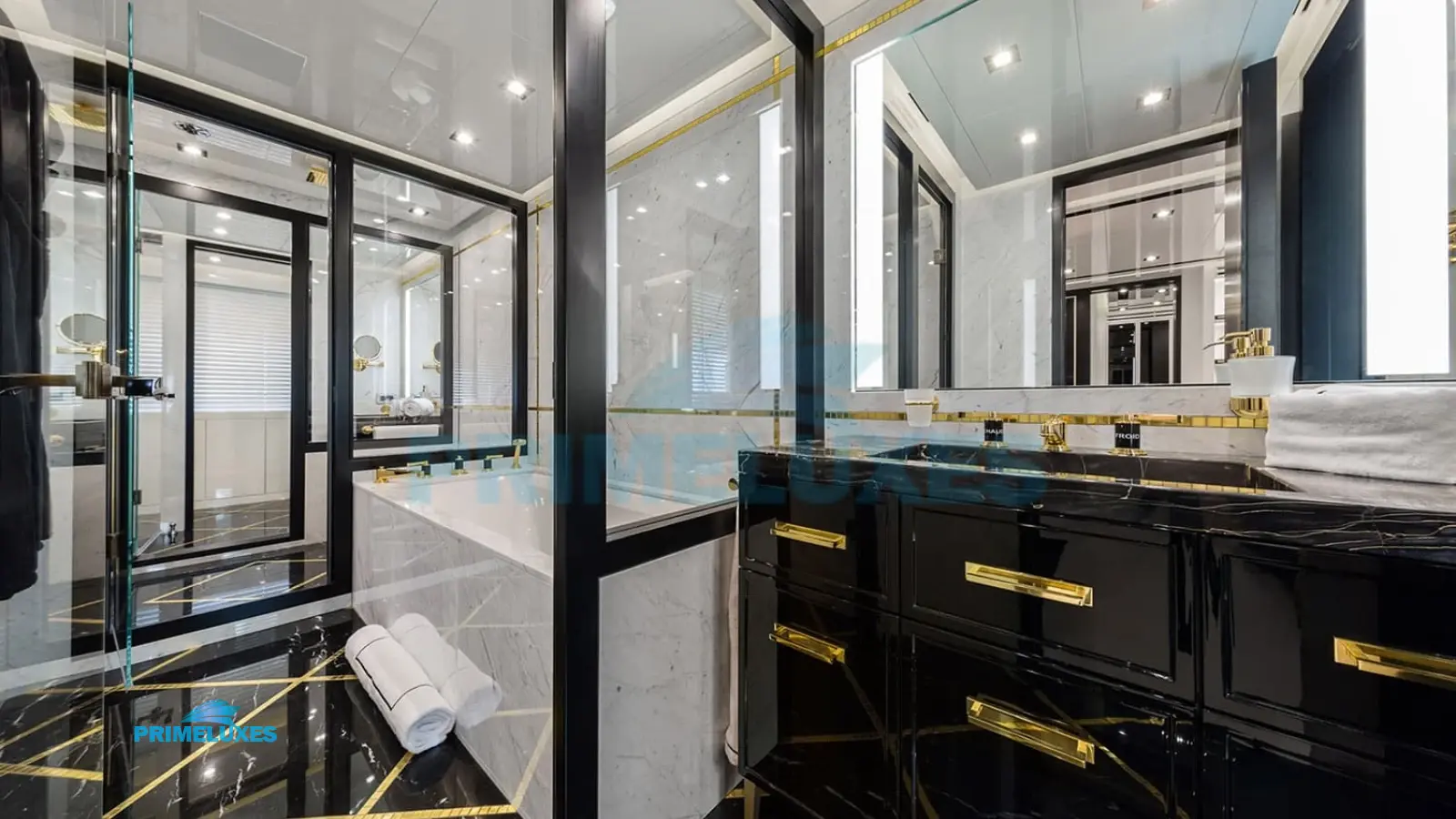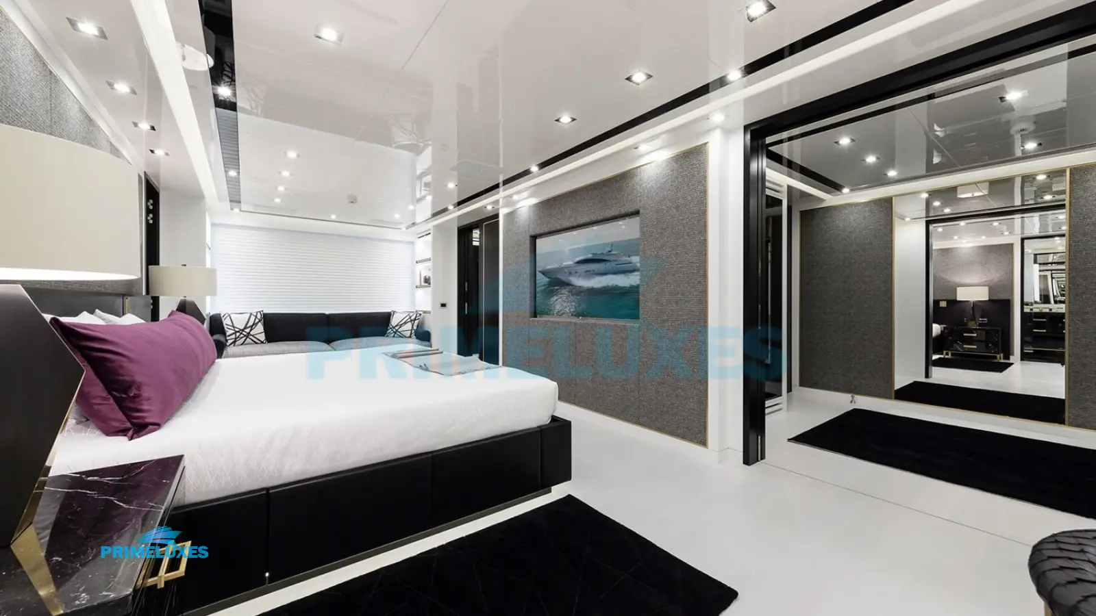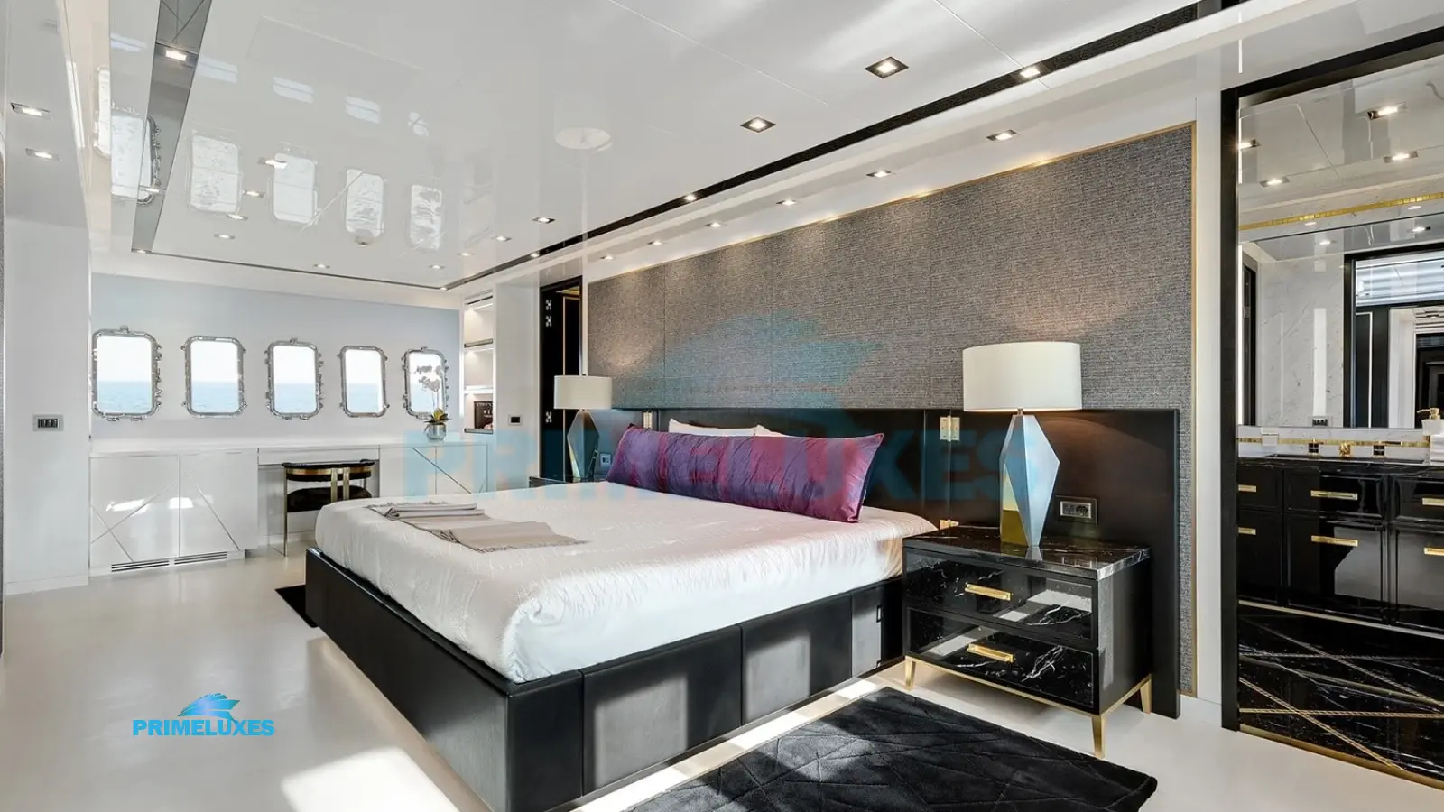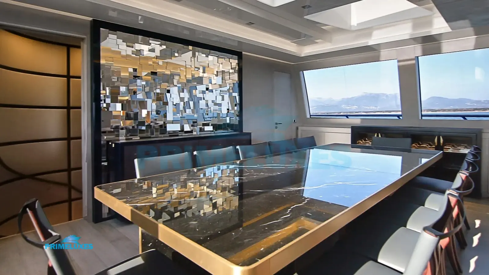 Step inside to discover a world of mirrored illusions, rich textures, and sophisticated décor, where every space exudes opulence. The flybridge is a highlight, featuring a large bar and plush lounge area, perfect for sunset cocktails with panoramic Mediterranean views. Forward, a spacious solarium and inviting Jacuzzi create an idyllic setting for relaxation under the sun.