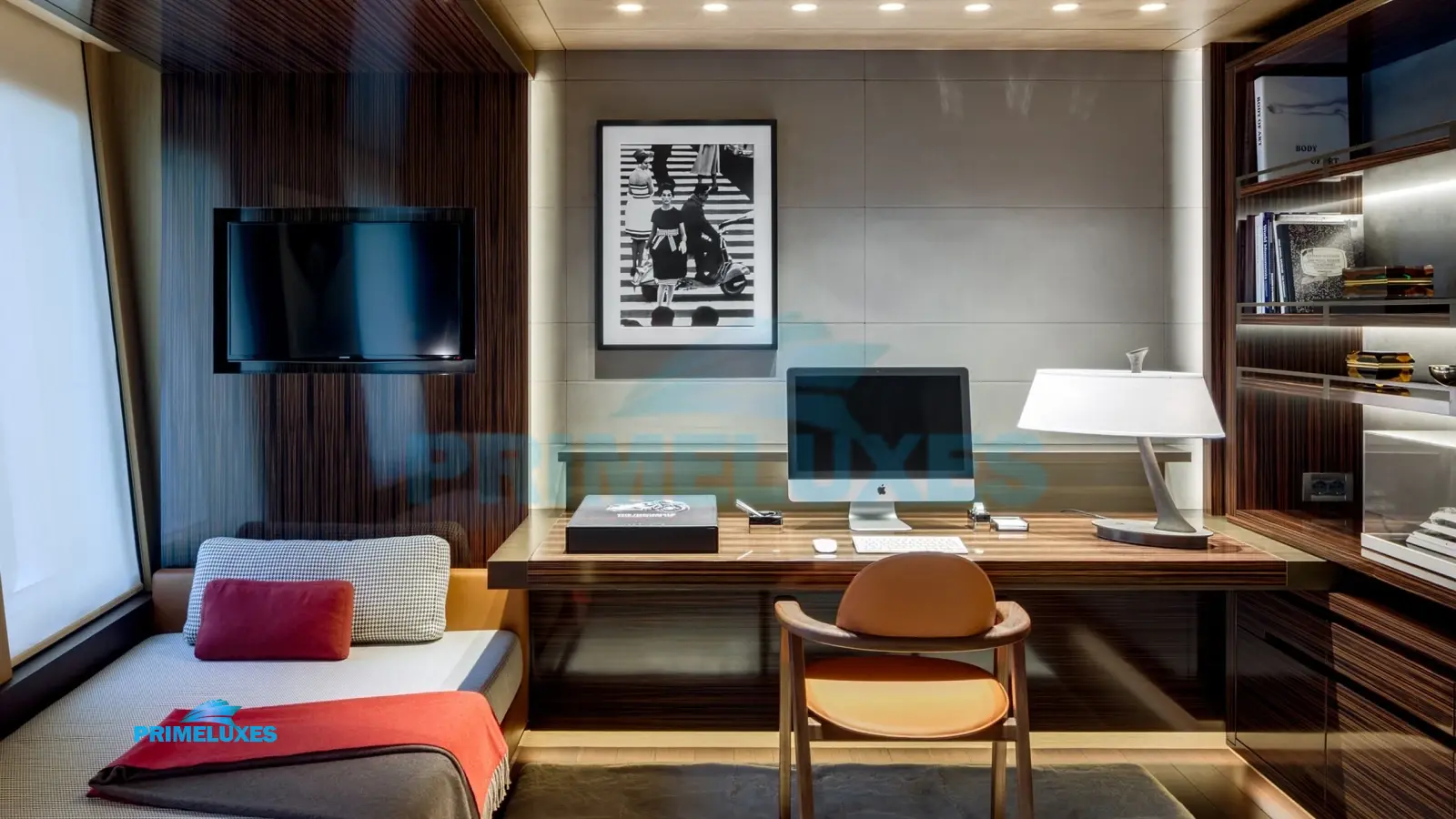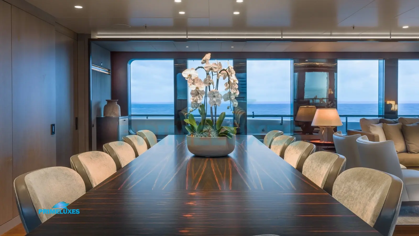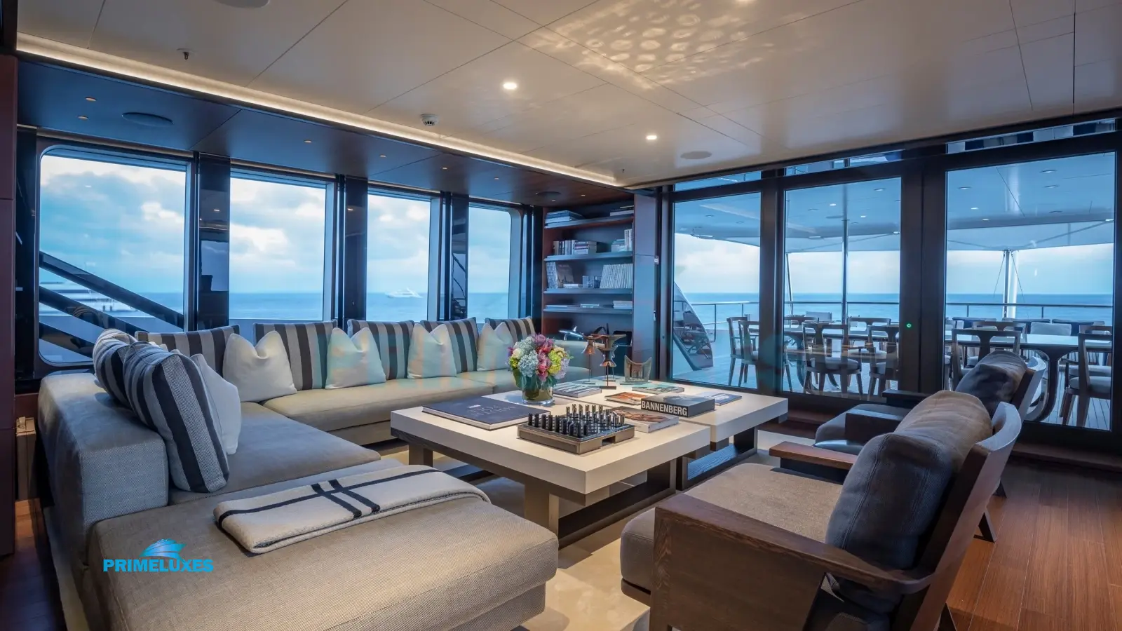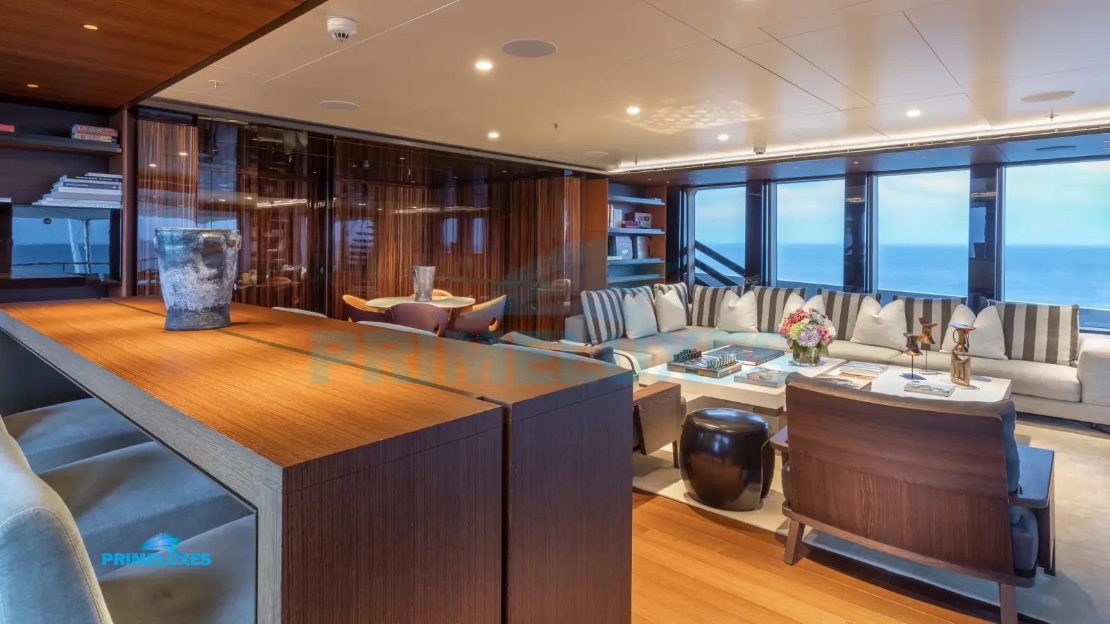 HALO’s interior is a masterpiece of modern elegance, featuring light oak paneling, marble accents, and bespoke furnishings. The main salon offers a sophisticated lounge and formal dining area, while the upper deck sky lounge provides a more relaxed setting with a bar and entertainment system.