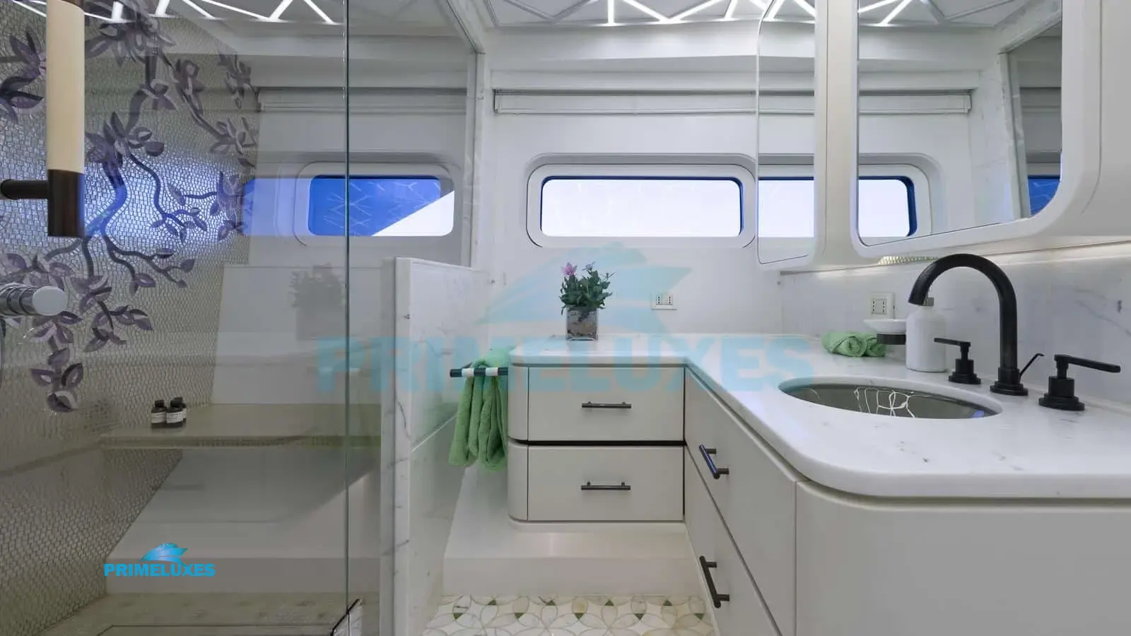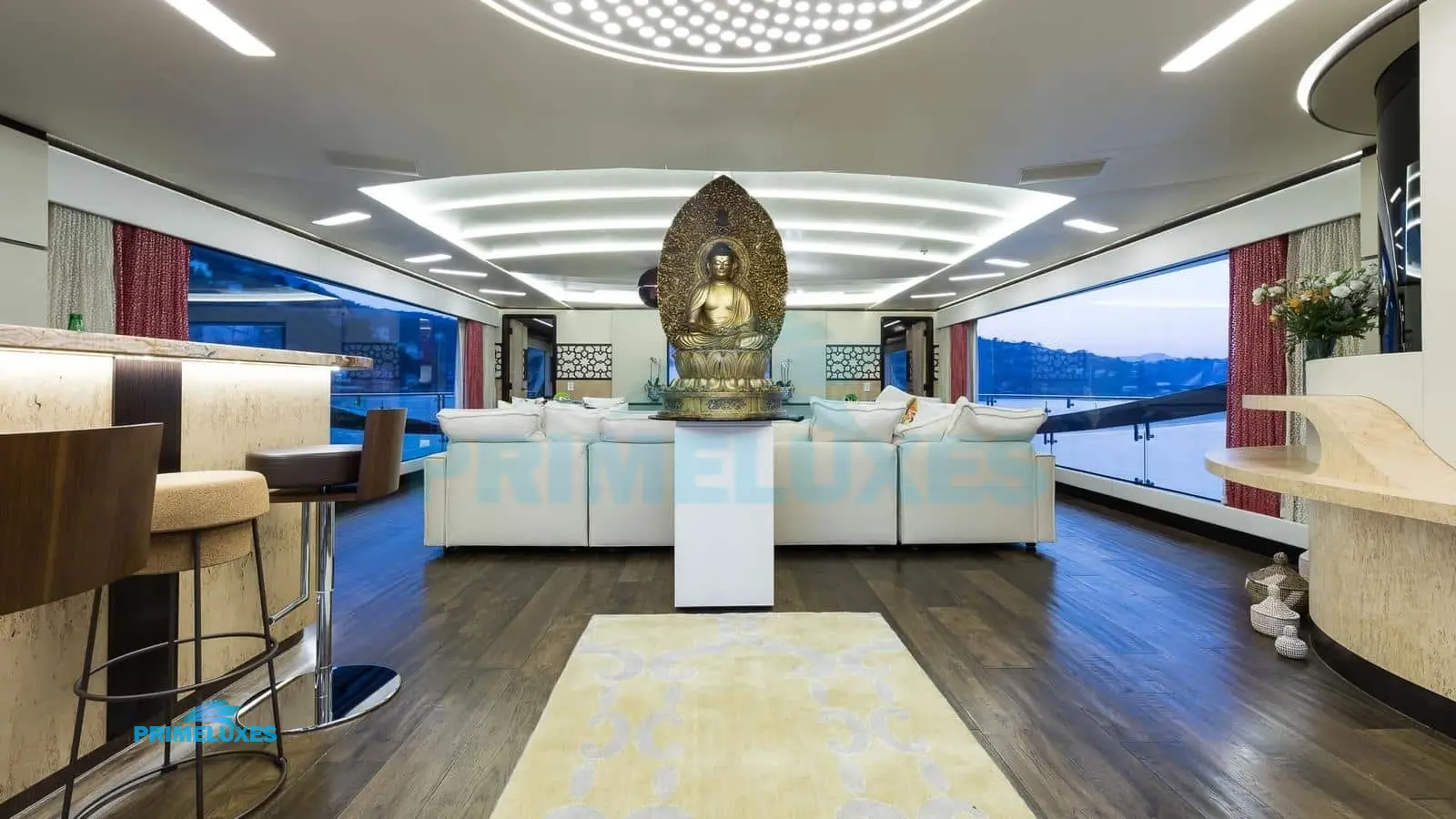 Entertainment & Leisure: The yacht boasts a beach club, stabilizers for smooth cruising, and a selection of premium water toys for endless adventure.