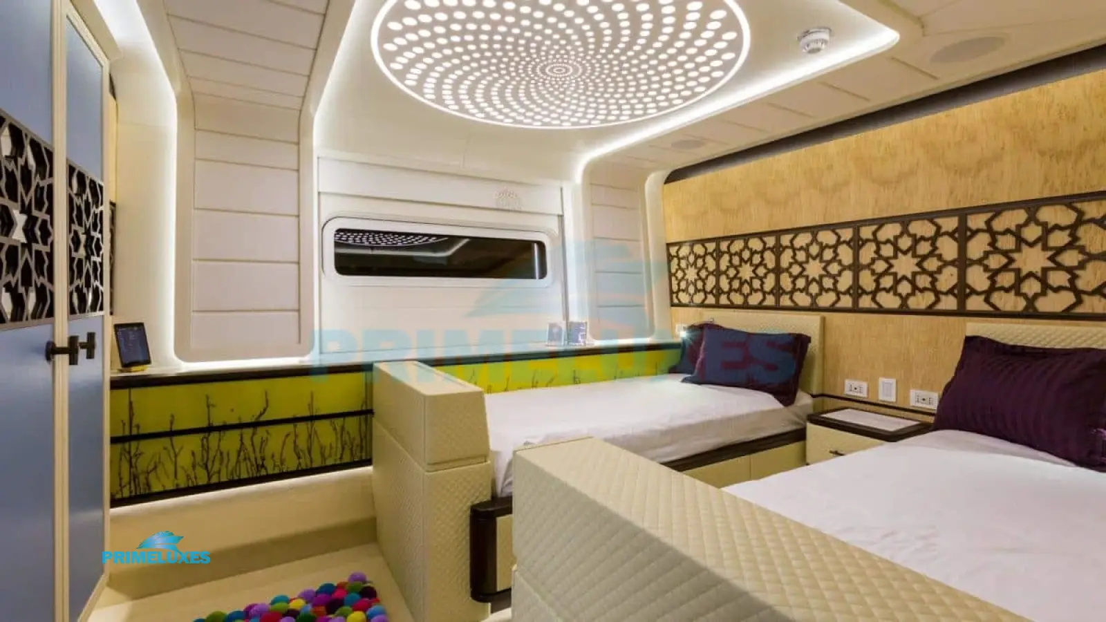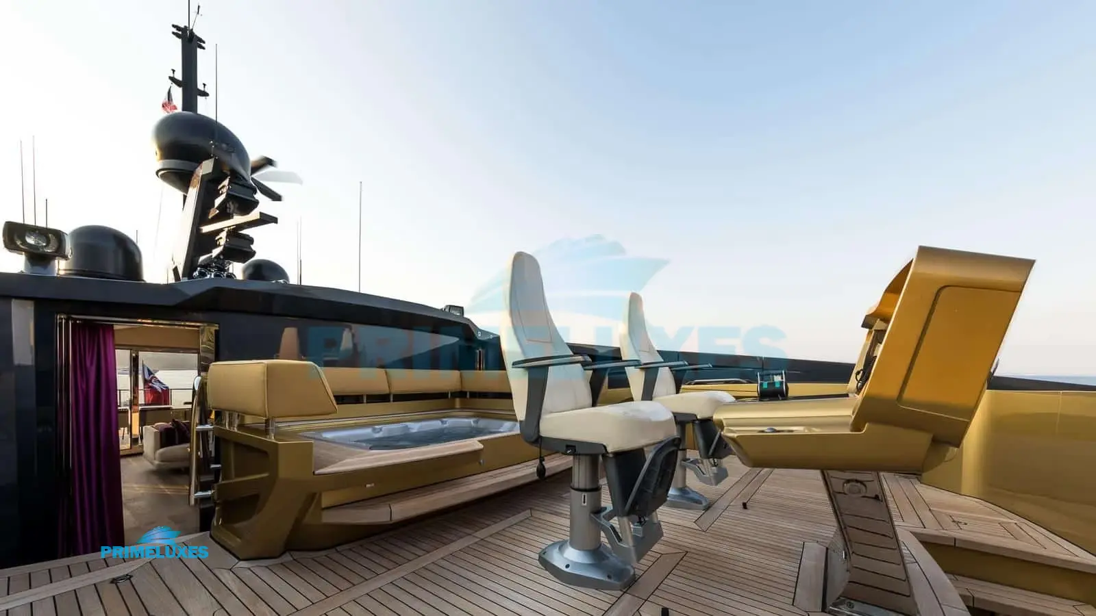 KHALILAH’s striking all-gold design and sleek exterior lines make her an instant icon among luxury yachts. Step inside to discover a contemporary, vibrant interior, where natural light enhances the rich textures and bespoke finishes. The spacious saloons, elegant dining areas, and sumptuous cabins rival the finest five-star hotels, with the master suite featuring a luxurious dressing room, ensuring an indulgent retreat.