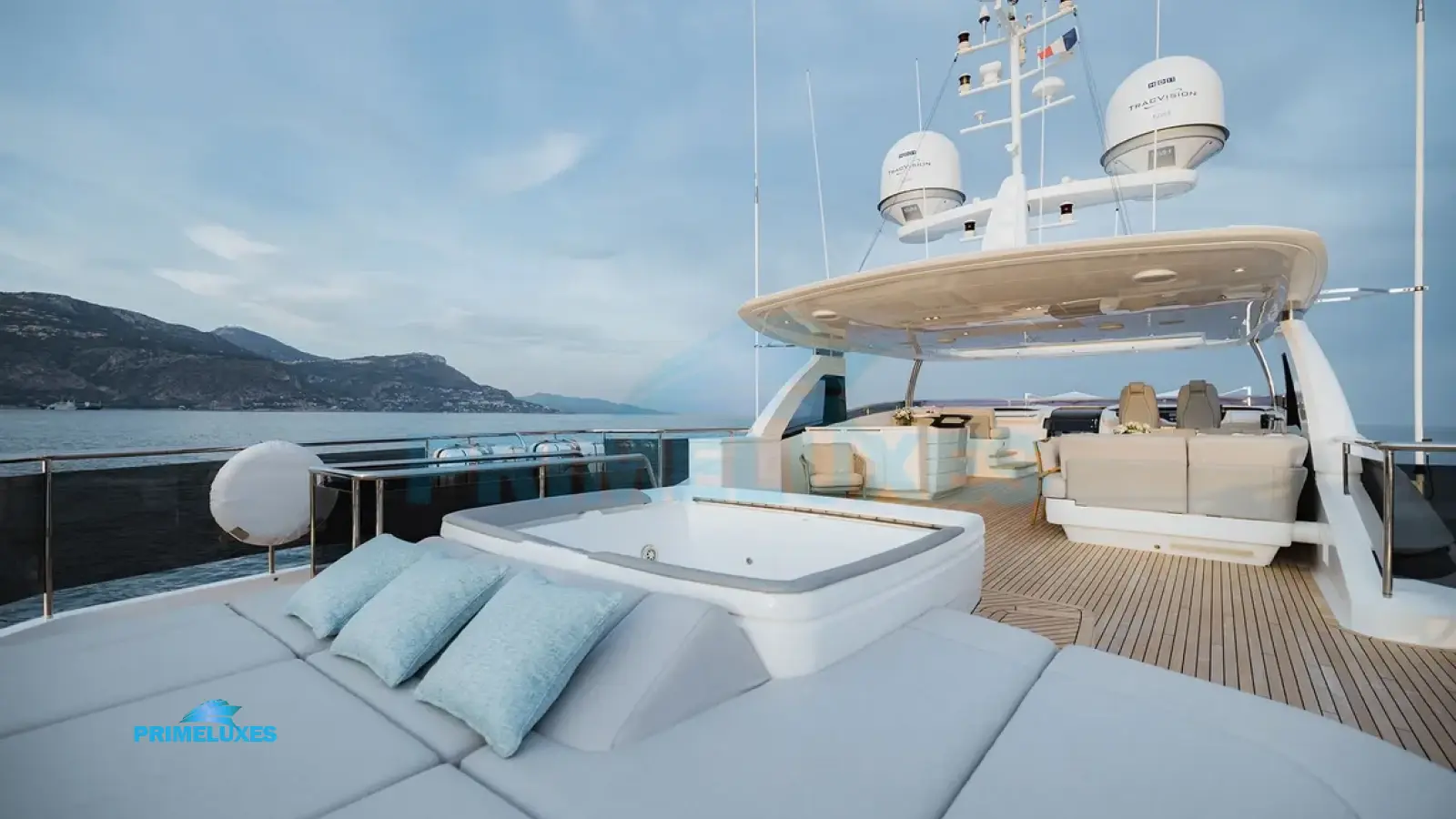 Expansive flybridge with a Jacuzzi, sun loungers, and al fresco dining—perfect for sunset cocktails.