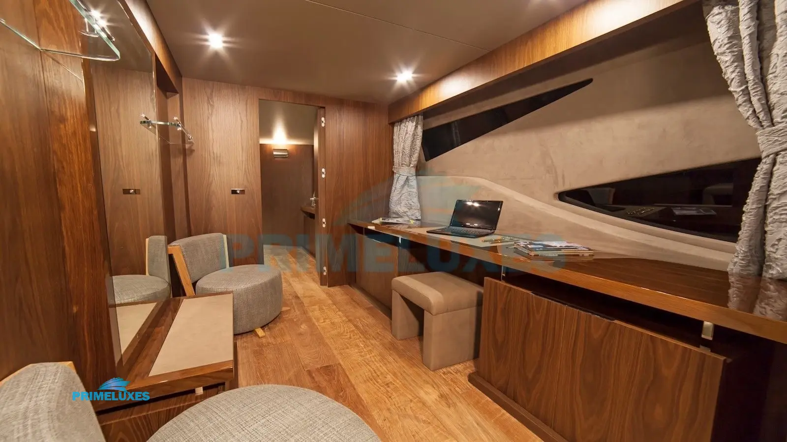 The contemporary salon features a bright, convivial lounge, perfect for unwinding after a day of exploration. A glass dining table sets the stage for gourmet meals prepared by the onboard chef, while a private study provides a quiet retreat for those needing to work remotely.