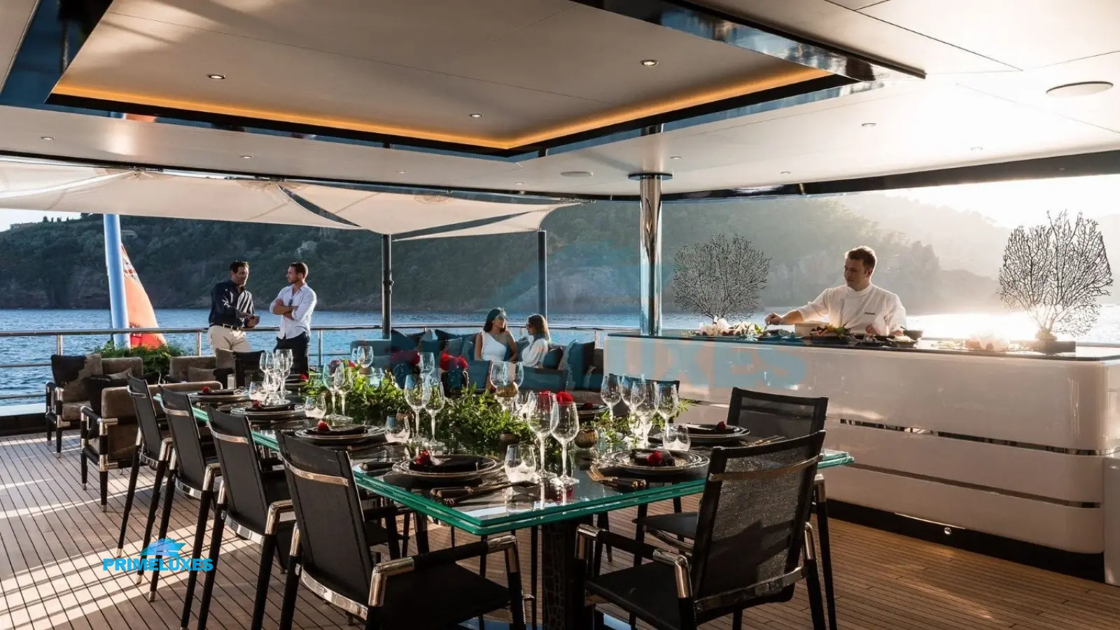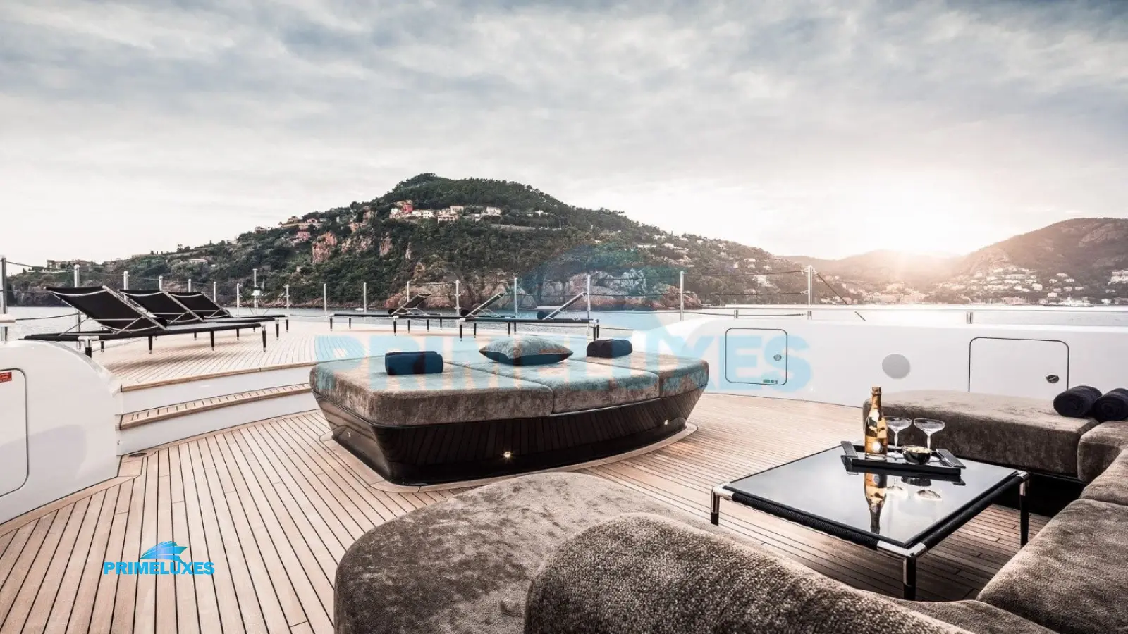 Sun Deck: A private oasis with a Jacuzzi, sun loungers, a full-service bar, and al fresco dining under the stars.